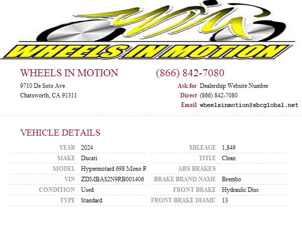 The bike is equipped with lightweight cast rims with five Y-spoke design, for a weight reduction of 1 lb. compared to a similar set of spoked rims and even greater riding precision. The bike mounts Pirelli Diablo Rosso IV tires. A 160/60 was chosen for the rear, the ideal size to highlight the dynamic qualities of the Hypermotard 698 Mono.