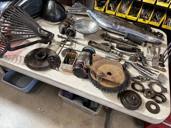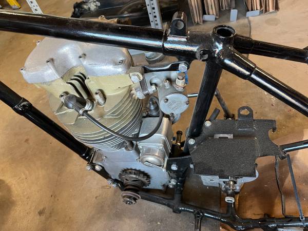 1952 Velocette 350cc MAC - Rigid frame with Dowty telescoptic forks (original). This machine is 98% complete including rare sheet metal parts: good gas tank, correct front fender, new rear fender with extension, dynamo covers, chain cases and front & rear chain guards. Also front and rear seats with new covers. Seats have springs. Spare cylinder head (head on bike has two broken fins). Engine: restored - do believe - ready to go. Complete 4 speed gearbox in frame (painted). Complete wheels with axles, both brake plates/shoes. Includes BTH Magneto, Miller dynamo and regulator. No wiring loom - but- very simple. No speedometer. Good gas tank - all correct.
