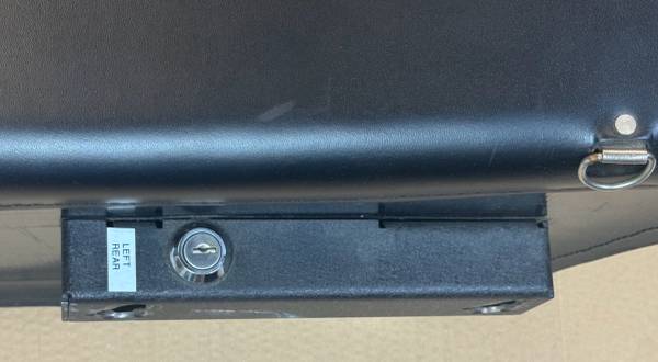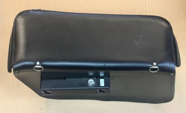 Leather straps buckle down and also have clip release catches under the leather straps.