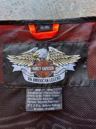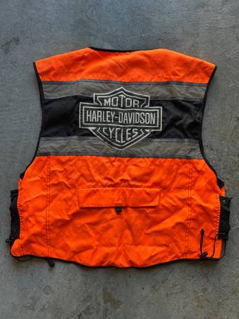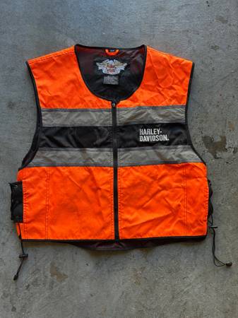 Harley Davidson hi-vis riding vest. The tag says XL-3XL. It’s a bit battered but it’s functional.