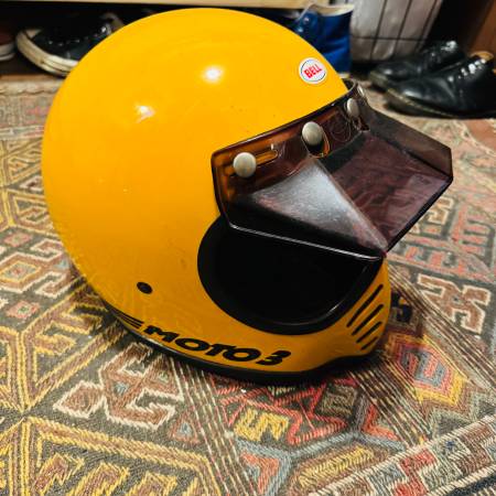 Vintage Yellow Moto 3 helmet. Very good condition. Original paint and parts. Size 7 1/8, 57. Firm on price. Text me at: Paul Six19 eight07 748one Thanks