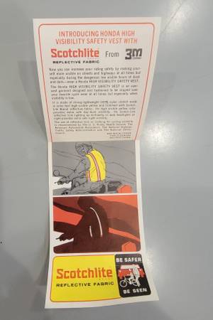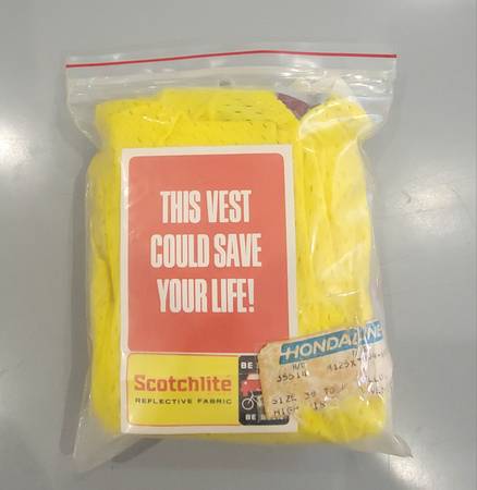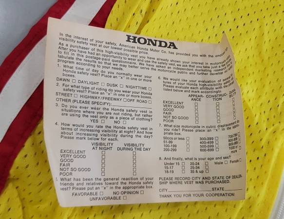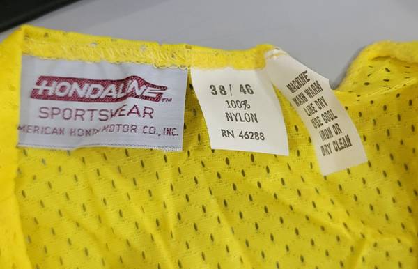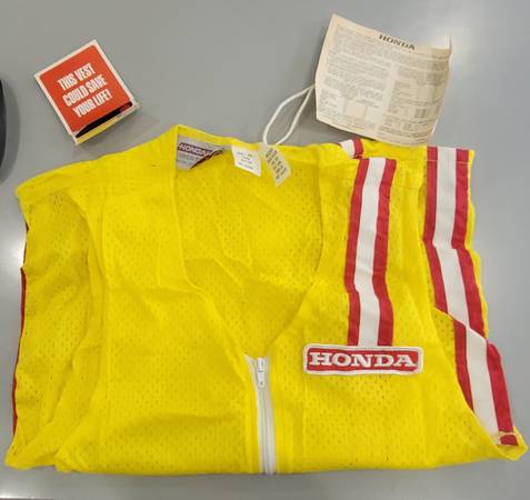 **** Year: 1970s - 1980s **** Condition: New -NOS **** Material: 100% Nylon **** Make by: Hondaline/ America Honda Motor Co. Inc. ****Size 38/46 **** Color: Yellow with red and white trim, Honda Patch Logo, and Reflective Fabric Material. ****Lowball offers will be ignored.**** NOTE: Small Size.
