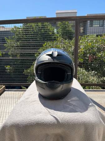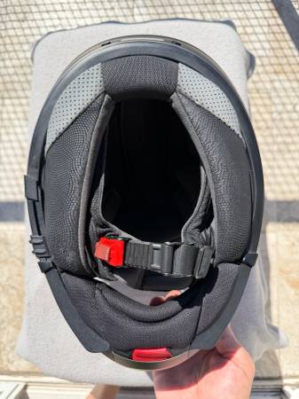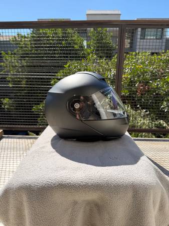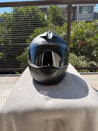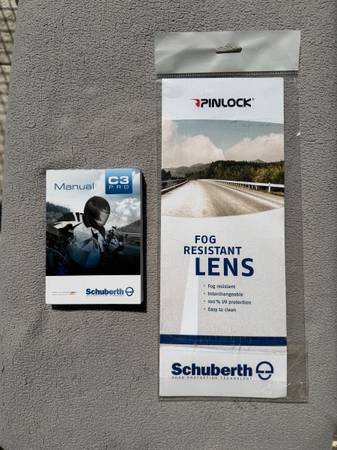 Loved this helmet! It’s modular, has a sun visor (not shown in these pictures: see their website) and extremely practical. Only selling because I sold my bike as soon as my daughter was born, so I don’t need it anymore. There’s nothing wrong with the helmet. It has a few light scuff marks, but no dents whatsoever: it was never dropped. Comes with an extra fog resistant lens, the original user manual and a cloth storage bag. It’s clean, and being offer for much less than the $800 I paid for it when it was the top of the line helmet Schuberth offered. (I also have a medium sized one for sale that my wife wore, maybe 10 times. It’s in even better condition: basically flawless. They match. Great for couples.)