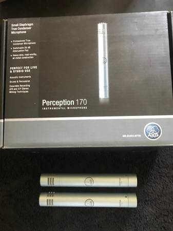 AKG Perception 170 Condenser recording mics in excellent used condition. Matched pair, great for: Acoustic guitar, overhead cymbals, percussion, and other instruments. Will test for buyer. Three 2 three 3 seven 6 seven 1 nine 2.