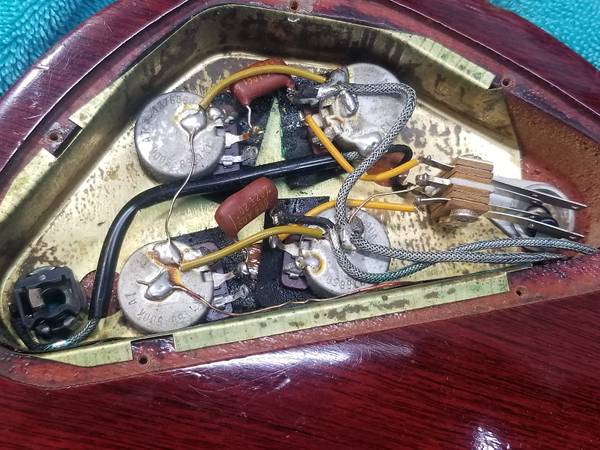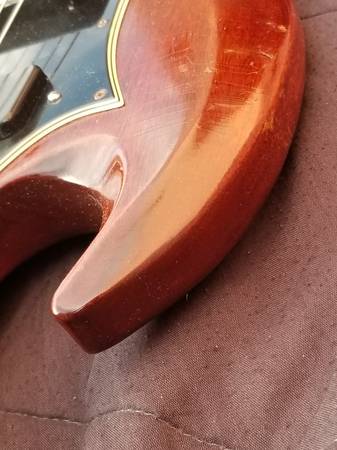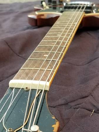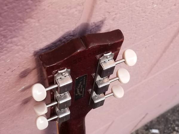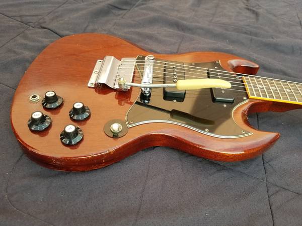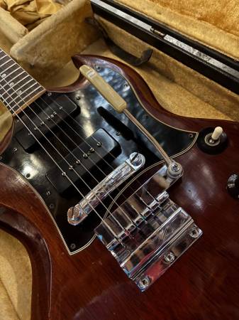 beautiful SG in excellent condition, no breaks, no repairs, frets in great shape.The tuners may have been replaced, if so it was a long time ago, some of these 68-69 SG specials have classical style tuners, some have the Kluson seen here. The electronics are original except for a replaced input jack. Also I changed the vibrola arm because the original didn’t seem to fit right. I still have the one that was on the guitar when I bought it so that will be included. Some people prefer a hard tail but I find the vibrola very musical and much easier to string than a Bigsby. Nut width is 1 9/16. These late 60s SGs have necks that taper, they are thin at the nut (depth-wise) but get fatter as you get to the heel; it is very comfortable to play. The codes on the pots are "6850" which means this guitar was either made in late '68 or early '69. I don't know if it's the original case but it looks to be period correct, one latch is broken, it's fine for storing or carrying the guitar, but you'd want something new if you're going to take it out to gigs.