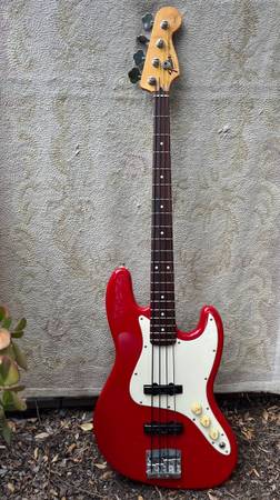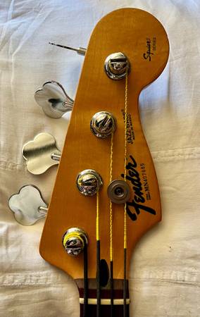 Fender Jazz Bass ‘Squier Series’ in excellent condition improved with DiMarzio humbucking Jazz Bass pickups, new pots & Fender high-mass bridge, tapewound strings. Buyer is welcome to original parts and roundwound strings. Plays and looks great. Very nice maple used for the neck, the Mexican luthiers really know how to carve them. Plus it’s 1/3 of a century in age so ‘very nice’ as Borat would say.