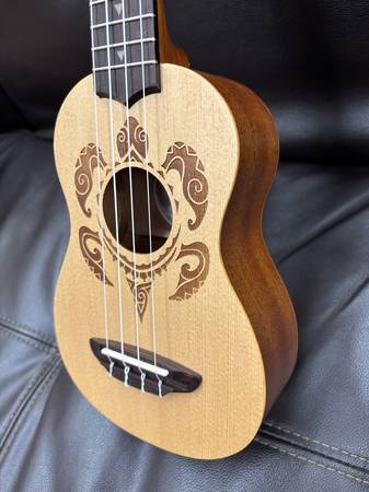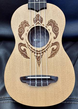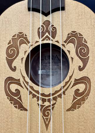 The Luna Honu Turtle Spruce Soprano Ukulele boasts decorations inspired from traditional Hawaiian body tattoos. Hawaiian tattoo patterns and layout were strongly geometric with many shapes and symbols representing the natural island world: stones, waves, fish, sharks, turtles, rain, sun, birds. This design is based on a Hawaiian turtle (honu), a symbol of longevity and endurance rendered in a Polynesian tattoo style. The fret markers are stylized shark's teeth. Includes gig bag. This spruce top uke offers incredibly high quality at an exceptional price. Among our most popular models.