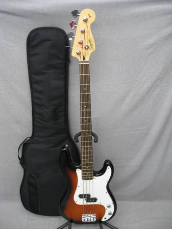 For Sale 1997 Squier Precision Bass 4 String Electric Bass Guitar Sunburst. In Good Condition. Has minor chip on the body (pictured). Made in Korea. Comes in Pictured Gig Bag. Guitar Stand NOT...