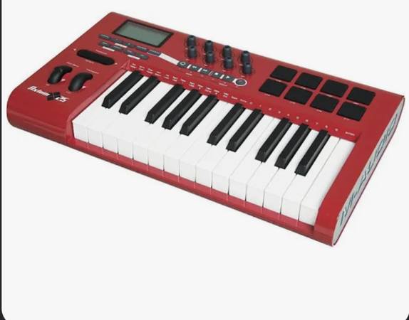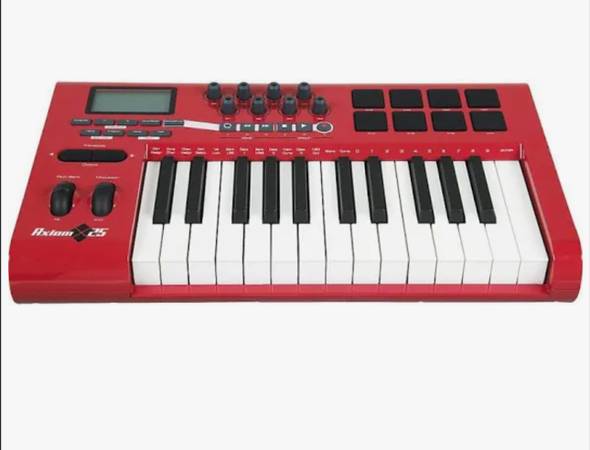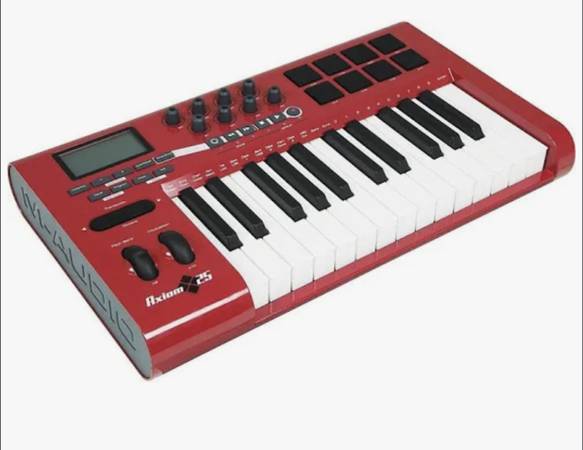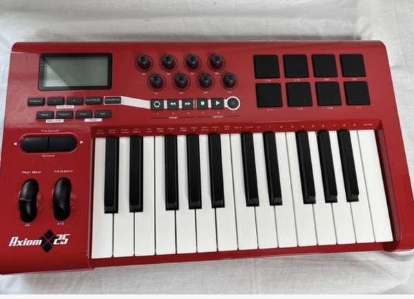 M-Audio offers the compact Axiom 25 MIDI controller in an extremely limited, special red edition. But don't let the Axiom 25 keyboard's size fool you. This advanced 25-key USB mobile MIDI keyboard controller features both semi-weighted action and assignable aftertouch, plus 8 rubberized trigger pads that put drum programming and performance at your fingertips. Eight endless rotary encoder knobs on the M-Audio Axiom 25 puts synth parameters, virtual mixer controls, and more in your hands. Six assignable transport controls can command other MIDI parameters. Virtually everything is freely MIDI-assignable”and the backlit LCD screen makes programming easy and intuitive. The M-Audio Axiom 25 gives you 20 memory locations for on-board storage, plus free Enigma editor/librarian software to manage an unlimited number of setups via computer.
