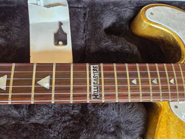 The name says it all! This is just 1 of 250 Japanese made Jazz-A-Caster's - Will Ray of the Hellecasters limited edition model. It features a gold leaf Telecaster body, a rosewood fretboard w/ pyramid shaped pearloid inlays, a Strat headstock, Schaller locking tuners, a set of special designed Seymour Duncan Jazzmaster pickups and the insane Hipshot Will Ray B-Bender, factory installed. The gold leaf finish is all there and there are just a few small marks. This is a super rare guitar that'll surely turn heads, give double takes, strike fear into the listener. And leave watchers shakin' their damn heads. This is not only highly collectable it is also a real showman/woman’s piece. It weighs about 8.6lbs on my scale, which is quite light given the hardware. This includes the original hardshell Fender case, candy and B-Bender hip trem bar.