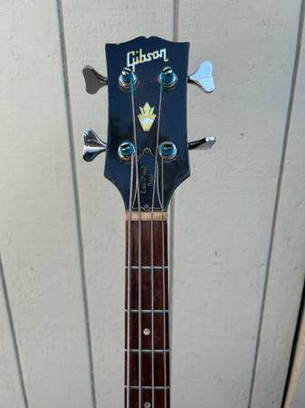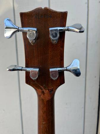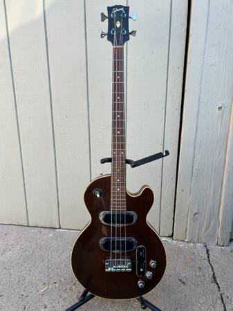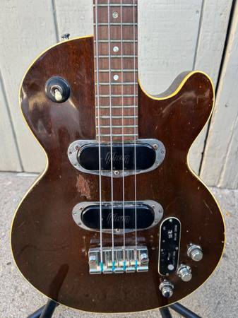 Hi! I'm helping my dad sell this super cool vintage 1969-1971 Les Paul "Recording" Bass (Walnut) in its original condition. Only modifications made were a repaired headstock, though it's 100% stable. My dad is a working bass player and used the bass with its repaired headstock for years, and can confirm it works great. This bass is Les Paul's first foray into using low impedance pickups for recording basses. My dad is only selling because, frankly, he has a rather large collection of basses and this one is a bit too heavy for him to play live (he's 70). However, he's on hand to answer questions for serious buyers.