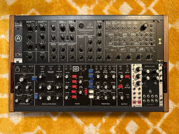 Everything in essentially like new condition. A tiny bit of wear on the bottom of the rackbrute, which is in the second picture. Was going to use this for a live rig but went in another direction :)