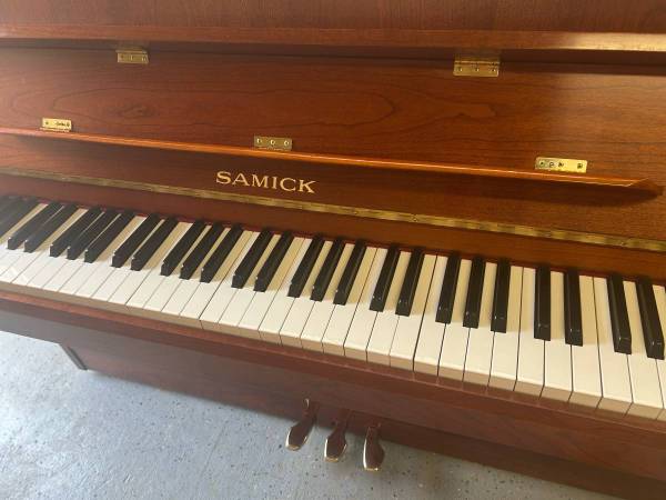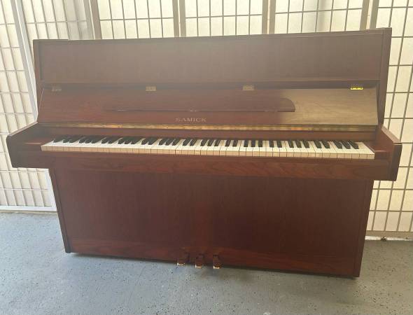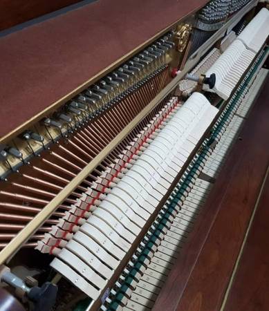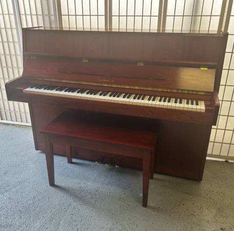 This compact studio upright piano, made in S. Korea 2001, compact 42” upright piano in beautiful cherry satin finish. Designed in the small-housing style, it fits effortlessly into apartments, studios, or cozy corners while still delivering rich tone and excellent touch. Recently tuned and checked all functionality in excellent condition. A rare opportunity to own a quality instrument at an unbeatable price, perfect for students, teachers, or anyone seeking a space saving yet expressive acoustic piano. Delivery included.