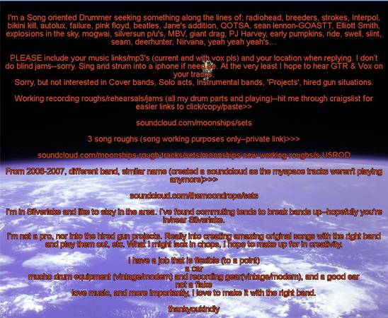 >>When replying, pls note that you've actually read this ad AND listened to some of my trks. IF you don't mention this, I will assume you didn't and are just mass replying to all drummers on CL.