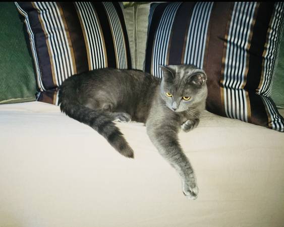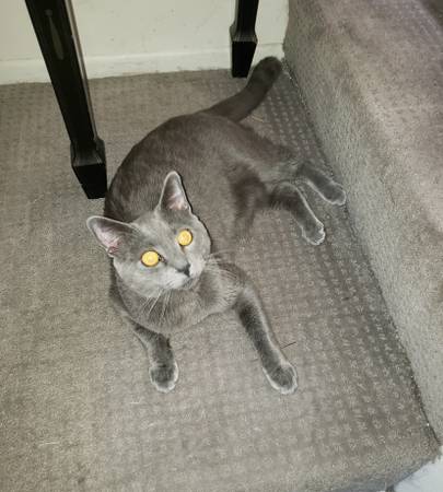Free Cat to Good Home. All Grey with Yellow Eyes. Carlo is 3years old Male Cat and has been Neutered with Shots. He is mostly indoor but he can be outside. He will be shy at first but will be attached once settling in his new home. Carlo loves playing with Cat Toys and he loves to Purrrr. Pictures sent upon request.