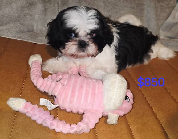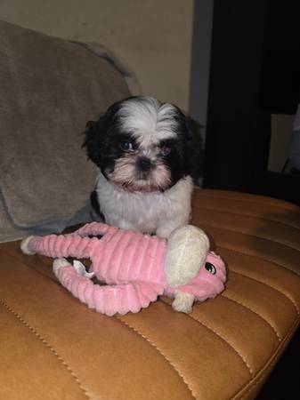 Healthy Shih Tzu puppy ready to spend the holidays with his new family. He has a beautiful black and white coat with 1 blue eye and 1 black eye, potty trained, very smart, playful and great temperment.