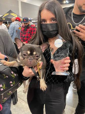 Hello I have a Frenchie female for rehoming she is 3 years old . She is a champion she compite .on some dogs shows we have the trophy of her winning 🏆trophy. Nirvana was the best chocolate . She is chocolate and tan color very strong healthy and very active . She is very calm as a walk companion. The reason is I move soon and looking to rehoming her. The rehoming fee the I ask is $1000. if you interested you can offer me but not to low. only serious person I pay $5000 when she was a 8 weeks old I have her paper shots . Call me or text me martin is my name her name is nirvana . show contact info