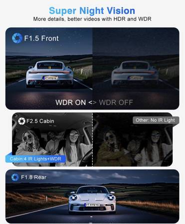 👉🏻【2K+1080P+1080P 3 Channel Dash Cam】Fiteye 3 channel dash cam features with 139°front camera + 132°inside camera + 130° waterproof rear camera, which can record the front, rear and interior details of your car at any angle. Ultra HD 2K+1080P+1080P @30fps resolutions, this dash camera for cars can capture more clearly roads signs and vehicle license plates, bringing you better driving pleasure and better security.