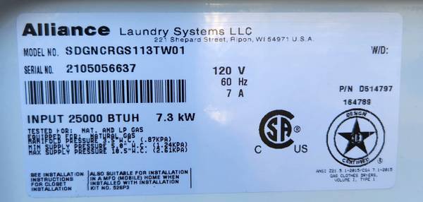 SPEED QUEEN 27LBS. MODEL: SC27MD2OU20001 Serial No: M0298121502