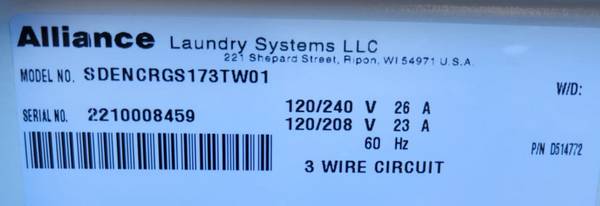 SPEED QUEEN 27LBS. MODEL: SC27MD2AU20001 Serial No: 0896087232