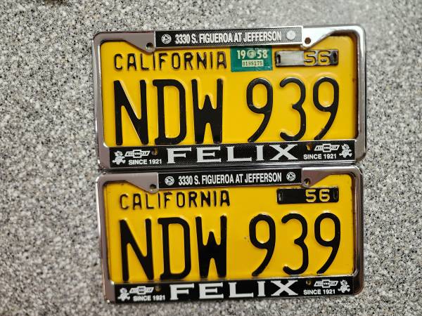 1956 California License Plates, original, Natural, include the original 1958 validation sticker, correct for a 1958 passenger vehicle, DMV issued letter "N" in 1958. Plates are in very good used condition except for, scratches & wear, no additional holes, no tears. DMV Clear Guaranteed, clear on 10/8/25. I'll provide DMV forms required. Frames not included.