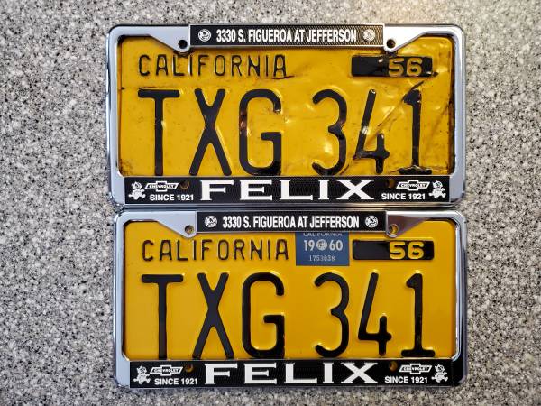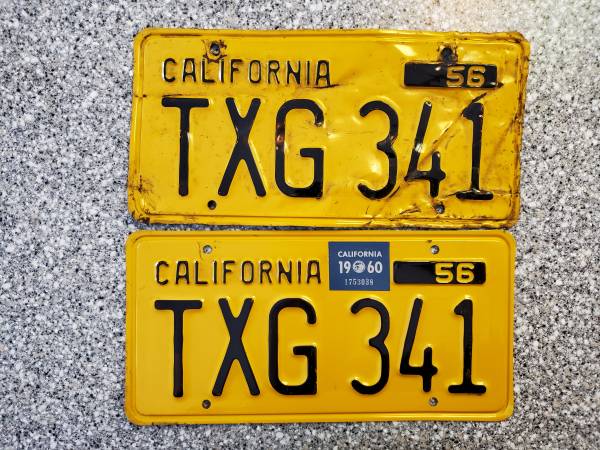 1956 California License Plates, original, Natural, include the original 1960 validation sticker, correct for a 1960 passenger vehicle, DMV issued letter "T" in 1960. Plates are in good used condition except for, front plate has dents, waives, wrinkles & wear, no rust, no additional holes, no tears. DMV Clear Guaranteed, clear on 8/11/25. I'll provide DMV forms required. Frames not included.