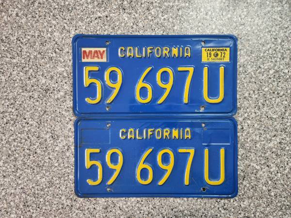 1970 California Commercial License Plates, original, include original 1972 validation sticker, correct for a 1972 Commercial vehicle, including El Camino, Ranchero, pick-up truck. Plates are in very good used condition, no additional holes, no tears. Price is based on the condition of the plates, DMV Clear Guaranteed, clear on 10/1/25. I'll provide DMV forms required.