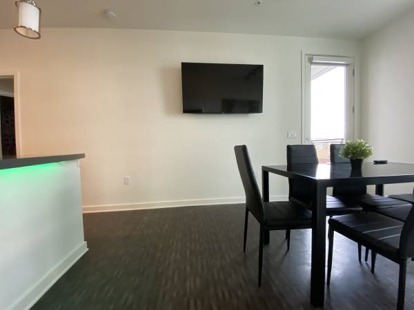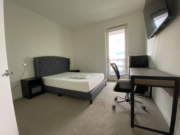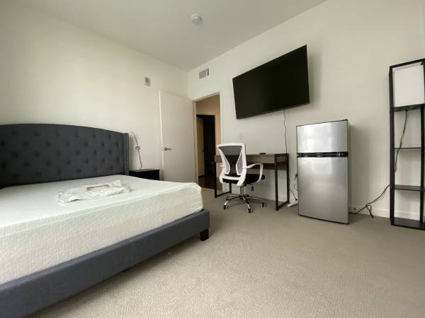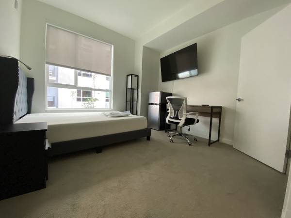 The room is furnished with a 55 inch tv, full size mattress, nightstand, desk/chair.