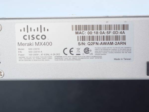Cisco Meraki MX400 Security Appliance, likely claimed, untested. Removed from a working environment but not tested and has been sitting for 2 years at this point.