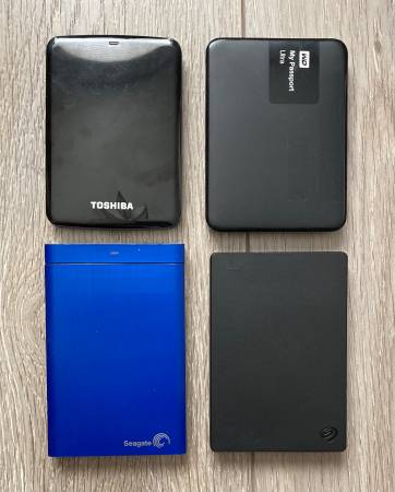 Various used SATA hard drives and portable USB drives for sale (Western Digital, Seagate, Toshiba, Hitachi). All have been tested/passed with manufacturer's diagnostic utility and wiped clean of data. Picture shows a sample of the drives.
