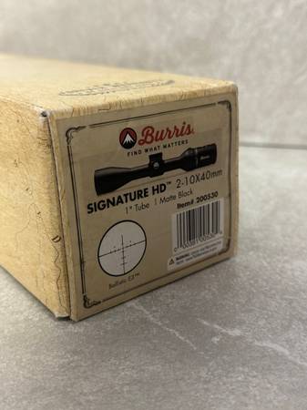 Burris Signature HD 2-10x40mm Matte Black Rifle Scope Magnification: 2-10x Objective Diameter: 49.2mm Objective Lens Diameter: 40.0mm Finish: Matte Original Box Included #1002566