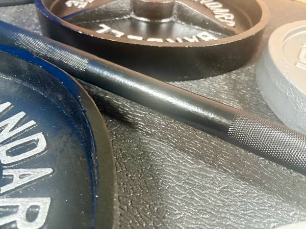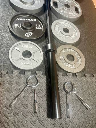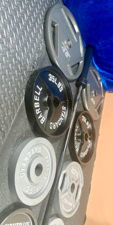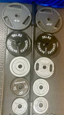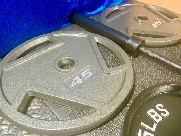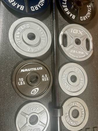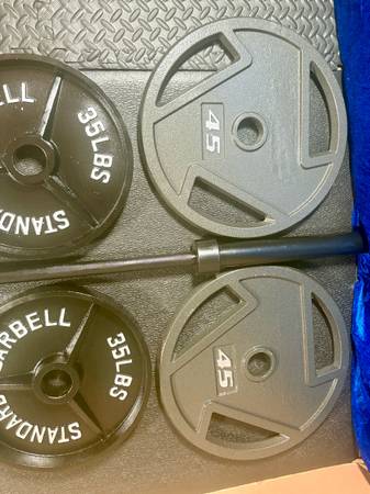 The Bar is Brand New as the 45s Rest of the plates reconditioned like New What you got: 2X45#, 2X 35#, 2X 25#, 2X10# and 2X5 pounds Weight plates plus a 6 ft Bar of 38# with spring clips. Brute...