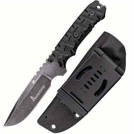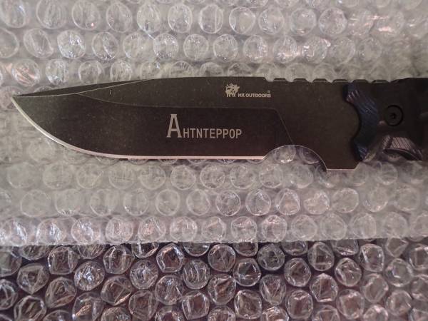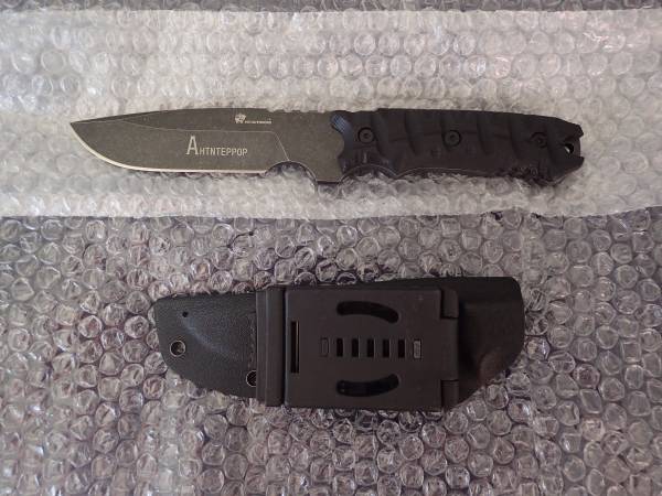 The knife has manufacturer and production stamps, such as D-134. Also there is a world "Anti-terror" in Russian language on the blade. each knife has its own unique number.