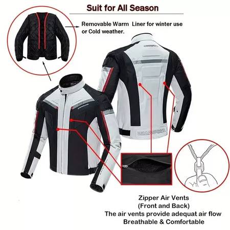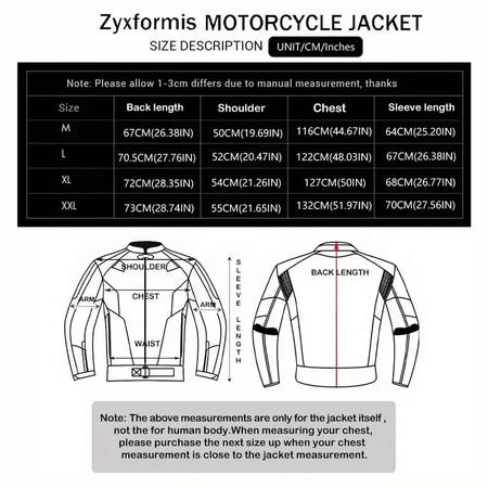 Zyxformis motorcycle jacket Specification: Name: Motorcycle Jacket condition: New gender: Men fabric: 600 Denier polyester (Oxford cloth) Lining fabric: Polyester mesh cloth Season: All season Spring, Summer, Autumn, Winter Protectors: Shoulder, Elbow, Back, chest Package includes: 1 x Motorcycle Jacket 1 x Removable Warm Liner 1 x Removable Back Pad 2 x Removable Shoulder Pads 2 x Removable Elbow Pads