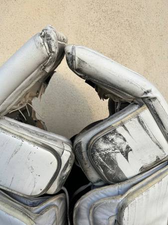 The pads were used for roller hockey and I originally covered them in hockey tape to protect them from getting scratched. There’s definitely stains on them, residue from the tape, they’re not perfect but they’re definitely useable. No tears, no broken straps. See all pictures for details. Any questions, feel free to ask.