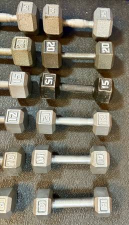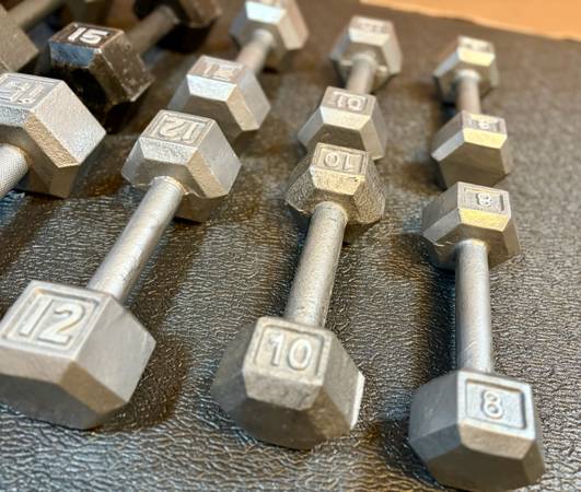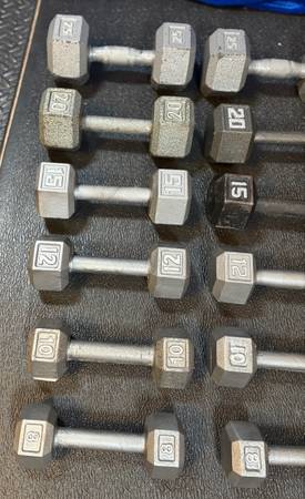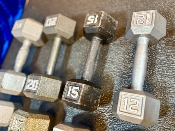 Cast Iron Dumbbells 25s, 20s and one of the 15s are gently used: perfectly clean One of the 15s, 12s, 10s and 8s are reconditioned(paint and metal exactly like the new ones... but in a better price)...