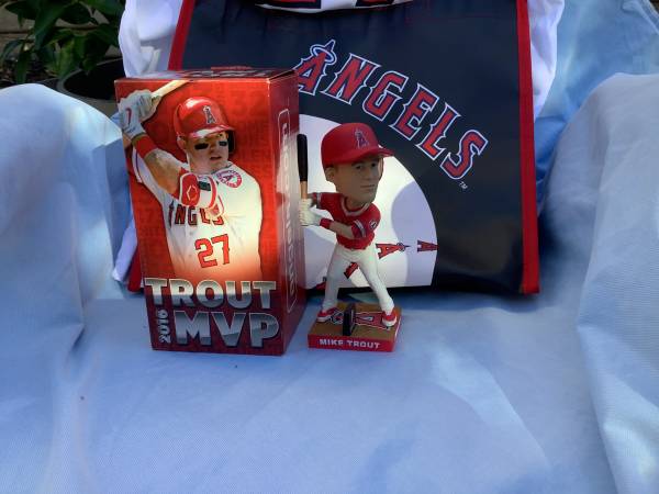 Vintage Mike Trout 2016 MVP bobble head in excellent condition in original box, with Extra Large Angels T-shirt and Game Bag. Add to your Mike Trout collection!