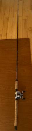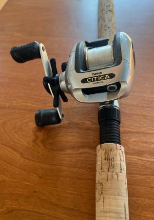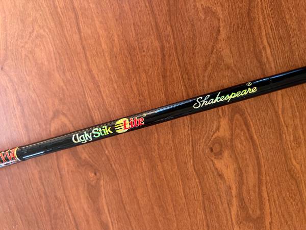 Selling as a combo, a Brand new old stock Excellent Condition Shakespeare Ugly Stik Lite 7 ft, 1-piece bass rod, rated 12-25 lb test paired with a used Shimano Citica Bantam 200 baitcaster.