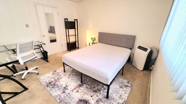 This furnished bedroom is a single occupancy 12x11 space with queen size bed, bookcase, workstation and full closet. The room is adjacent to another bedroom and the shared bathroom will be with another professional male in the nursing industry.