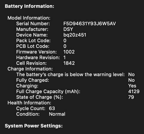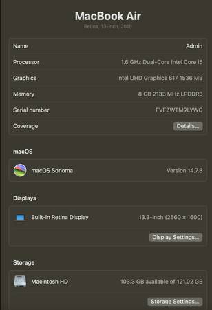 MacBook Air (Retina, 13-inch, 2019) “H91440” • Model: A1932 • Processor: Intel(r) Core i5 (I5-8210Y) • CPU Speed: 1.6 GHz • Storage: 128GB SSD • RAM: 8GB DDR • Cell Revision: 63 • Graphics: Intel...