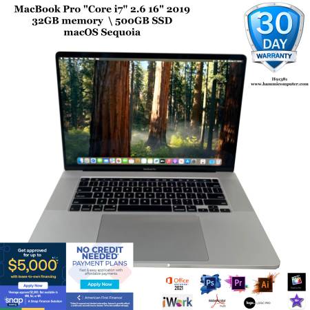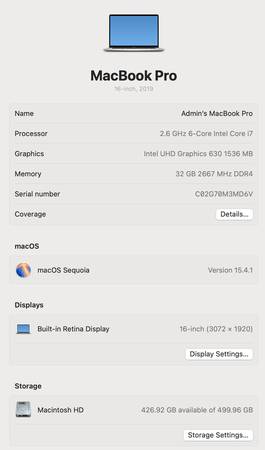 MacBook Pro (16-inch, 2019) “H91381” • Model: A2141 • Processor: Intel(r) Core i7 (I5-9750H) • CPU Speed: 2.6 GHz • Storage: 500GB SSD • RAM: 32GB DDR • Cell Revision: 371 • Graphics: AMD Radeon Pro...