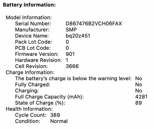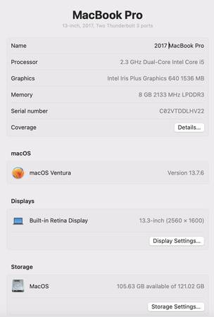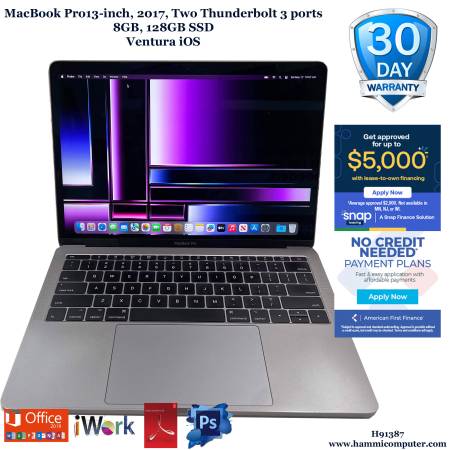 MacBook Pro 13-inch, 2017, Two Thunderbolt 3 ports “H91387” • Model: A1708 • Processor: Intel(r) Core i5 (I5-7360U) • CPU Speed: 2.3 GHz • Storage: 128GB SSD • RAM: 8GB DDR • Cell Revision: 59 •...