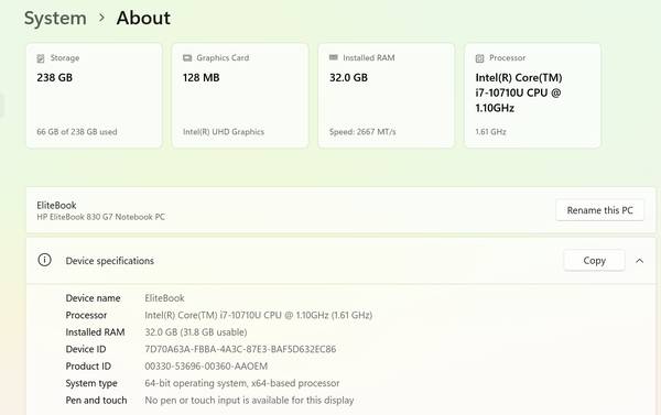 This 13" HP EliteBook 830 G7 Laptop, Intel i7, 32GB RAM, 256GB SSD is in excellent working condition.