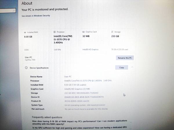 For Sale Used Dell Optiplex 7010 Desktop Computer 3.4GHz i5 8GB 250GB DVD-Rom Win10 Pro. Works Fine. In Excellent Condition. Windows 10 Pro 64bit + Microsoft Office 2007. Comes with Power Cord Only....