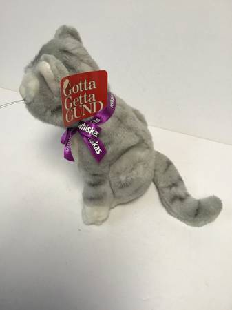 —1999 GUND Whiskas Cat Plush - “Marvin” grey & white w/black tripe - Purple Whiskas Tie - has original tag -