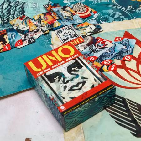 The fourth offering in the special UNO® Artiste Series features the distinctive bold style of “Obey” street artist Shepard Fairey. With contemporary graphics and intricate designs, Fairey’s art has reached everyone from skateboarders to presidents, inspiring fine art to activism. This special edition of the UNO® game features his art on every card as well as four special, two-sided cards that when put together create two different art pieces. It’s a game time masterpiece! Just as important – this deck is fully recyclable, with everything made from paper. In celebration of this special deck, Mattel has donated to Ocean Conservancy, a favorite cause of the artist.