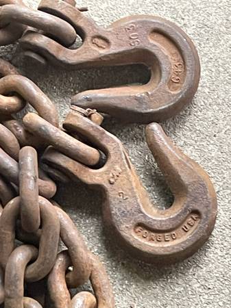 Chain is 16 feet long with forged hooks on each end and a load binder that works with the chain.---- 3/8" CHAIN IS RATED AT 7,000lb. safe load------ SEE PICTURES