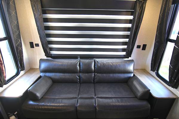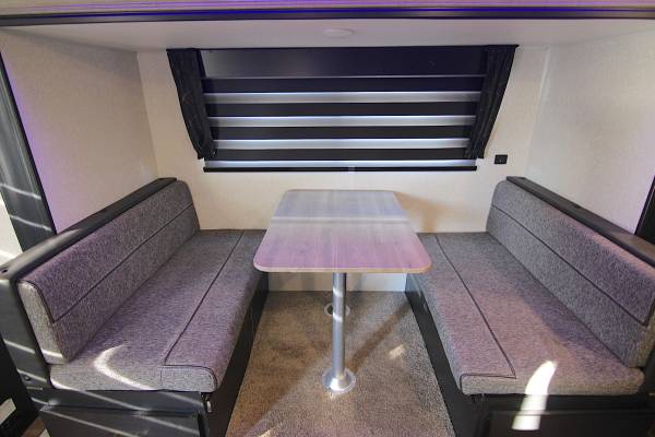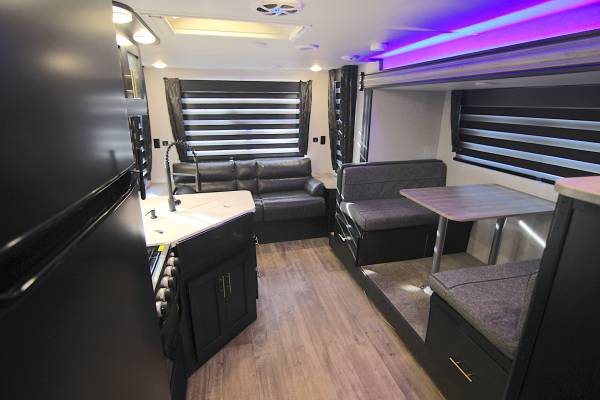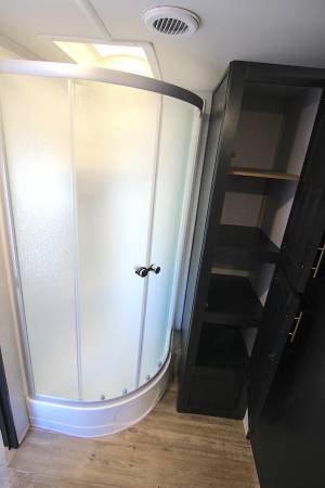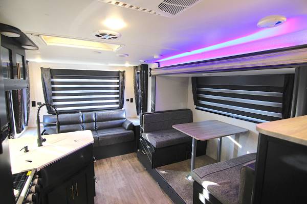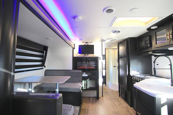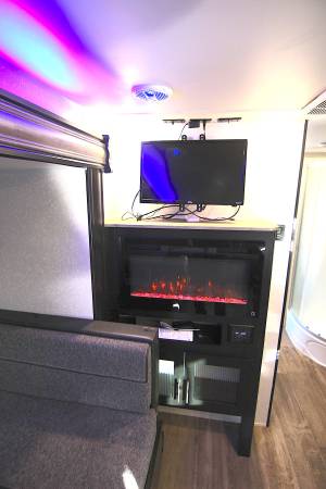 Front queen bed, electric fireplace, Sleeps 5-6, rear lounge, booth dinette, cold ducted rooftop air conditioner, dinette slide-out, electric awning with LED light strip, four stabilizer jacks, large outdoor storage, large residential refrigerator and freezer, roof top air vent, large glass shower with skylight, porcelain toilet, window shades, two axles, forced floor heat, six gallon electric dsi hot water heater, USB plugs, 30 amp service, aluminum exterior, outside speakers, cable ready, tons of storage, windows, outside shower and refrigerator, three burner cooktop, spare tire, microwave and oven,, outside TV hookups, black tank flush and more!!