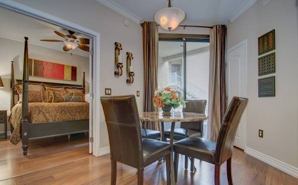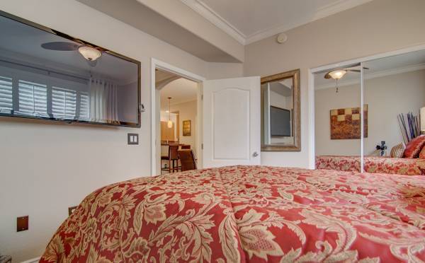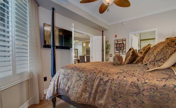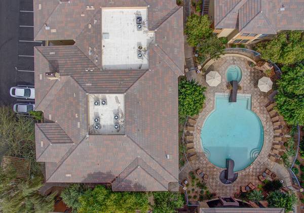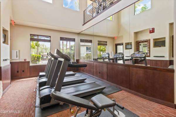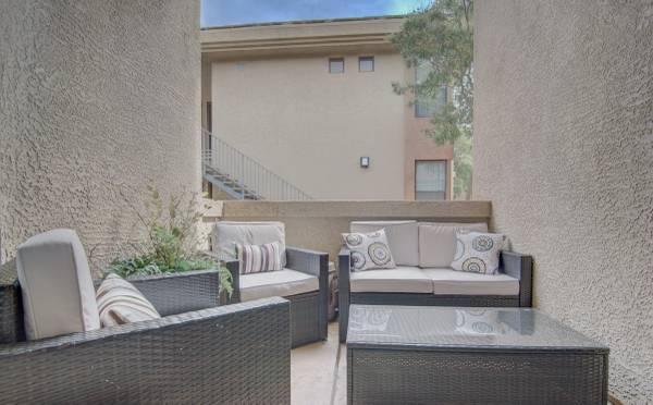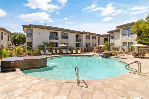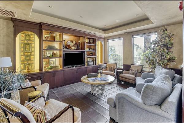 Step into luxury with this impeccably updated home, evoking the timeless elegance of an Italian villa. Both bathrooms feature exquisite travertine tile on floors and walls, creating a warm, Tuscan-inspired ambiance. The gourmet kitchen boasts premium Viking stainless steel appliances, granite countertops, and a reverse osmosis system, paired with rich wood flooring in the adjacent eating area. A new Bosch washer and dryer add modern convenience. This home is move-in ready with a new HVAC system, water heater, and thoughtful upgrades throughout. Hardwood floors grace both bedrooms, complemented by plantation shutters, contemporary drapery, blackout blinds, crown molding, and oversized baseboards in every room. Custom California Closets maximize storage, while ceiling fans ensure comfort throughout. The living room is an entertainer's dream, featuring a 5.1 surround sound system and a 60" flat-screen TV, furnished with a stylish leather reclining L-shaped sectional, a modern wrought iron coffee table, and coordinating end tables. The master suite elevates relaxation with a king-size bedroom set, a large flat-screen TV with a sound bar and wireless subwoofer, ideal for immersive movie nights. The second bedroom offers a queen-size bedroom suite, a 50" wall-mounted flat-screen TV, and a spacious closet organizer. Perfectly situated directly across from a multimillion-dollar clubhouse, residents enjoy access to a resort-style pool, state-of-the-art gym, espresso bar, computer room, kitchen, grand piano, fireplace, and a dedicated movie room. This prime location is steps from fine dining, a movie theater, grocery stores, Mayo Clinic, Barrett-Jackson Auto Auction, and the renowned TPC Phoenix Waste Management Open. Experience luxury, convenience, and an unparalleled lifestyle in this exceptional home.