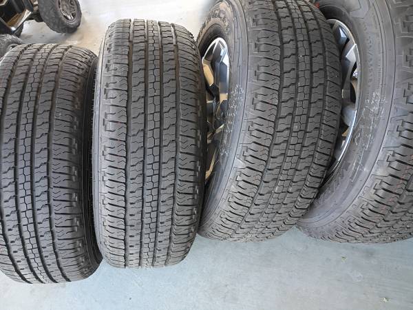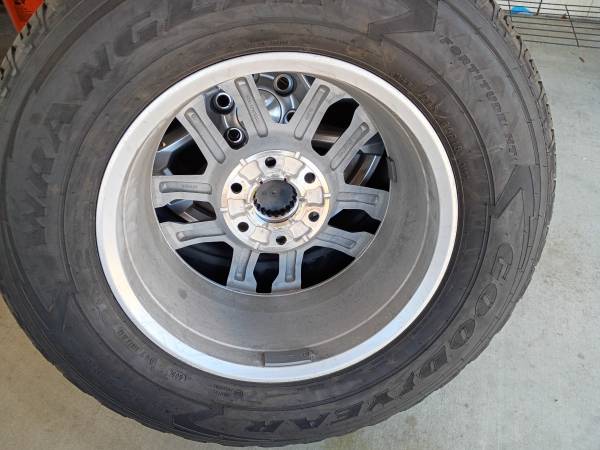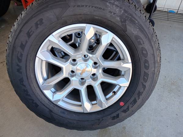 I have one new set rims and tires for 2025 chevy silverado size 275 65 18 goodyear 0 miles on them new condition FIRM PRICE call 323 646 2three64